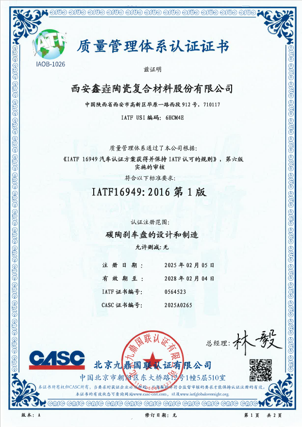近日,西安鑫垚陶瓷復合材料股份有限公司收到了北京九鼎國聯認證有限公司下發的IATF 16949汽車質量管理體系認證證書,認證注冊范圍為“碳陶...